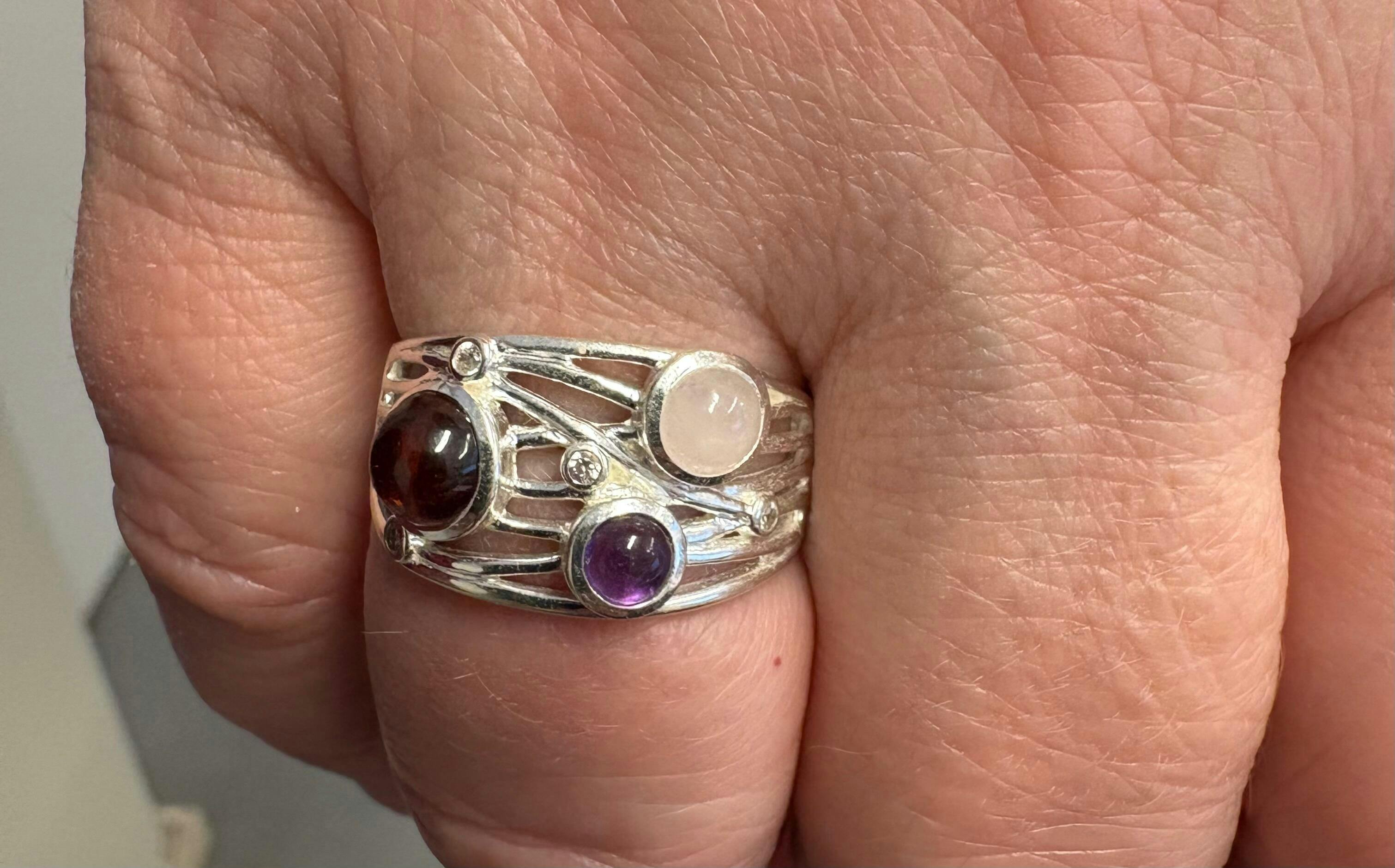 Leveä ja avoin hopeasormus, jossa vaaleanpunainen ruusukvartsi, lila ametisti ja tummanpunainen granaatti-korukivi.