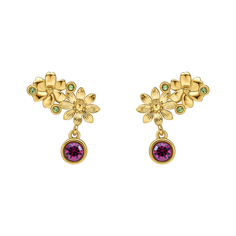 Laura Ashley Crosswell -korvanapit huokuvat brändille ominaista romantiikkaa ja ajatonta naisellisuutta: pehmeästi muotoillut kukat, raikkaat peridoottikristallit ja kevyesti liikkuva ametistikristalli muodostavat herkän, mutta katseet keräävän kokonaisuuden. Vihreä peridootti tuo kukkakuvioon raikkautta ja valoa, kun taas syvän violetti ametisti viimeistelee korut ylellisellä säihkeellä.