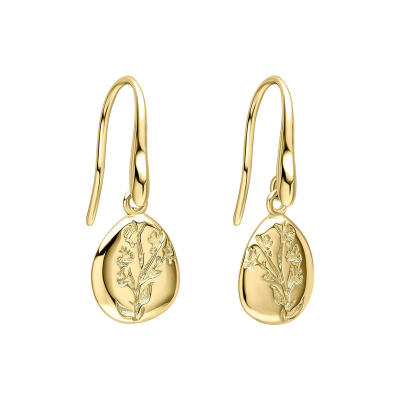 Inspired by Laura Ashley's Farlington Flowers designs, these dangling earrings reflect the delicate beauty of wildflowers and the poetic peace of nature. The organically shaped earrings are crafted from recycled silver and finished with warm yellow gold, which accentuates their soft lines and sophisticated look.