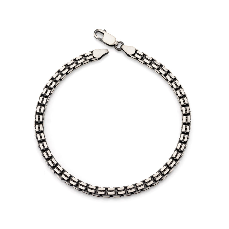 A masculine and stylish bracelet chain, made of bright silver with a darker finish. The chain is a so-called low armor chain, meaning the chain is wide, but has a slightly lower profile than a regular armor chain. This results in a chain that feels a little more comfortable and flexible in the hand.