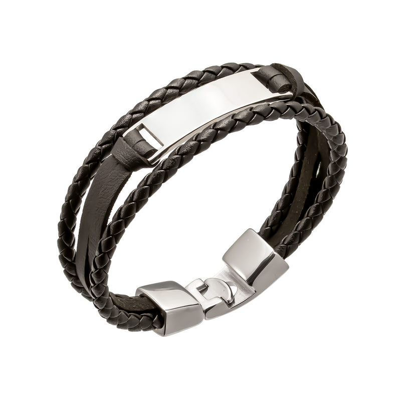A sturdy bracelet made of genuine leather. In the middle there is a plate that can be engraved with the text of your choice. The engraving is done with a laser, which ensures precise details.