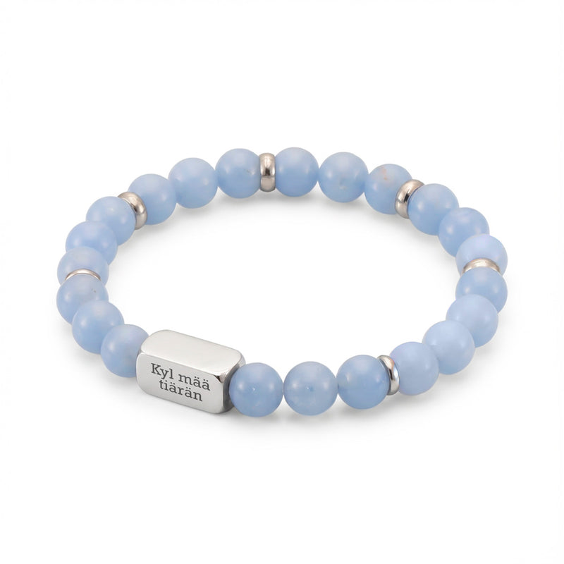 A beautiful blue angelite bracelet with your own text to decorate it.