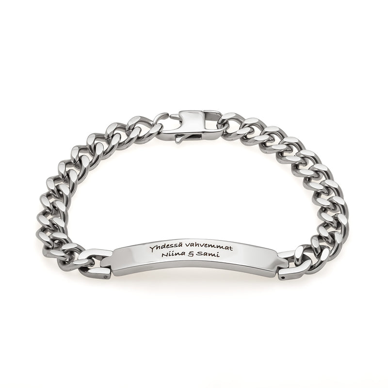 Tukeva rannekoru ruostumatonta terästä. Ketjussa on laatta, johon voidaan kaivertaa haluamasi teksti. Kaiverrus tehdään laserilla, joka takaa tarkat yksityiskohdat.