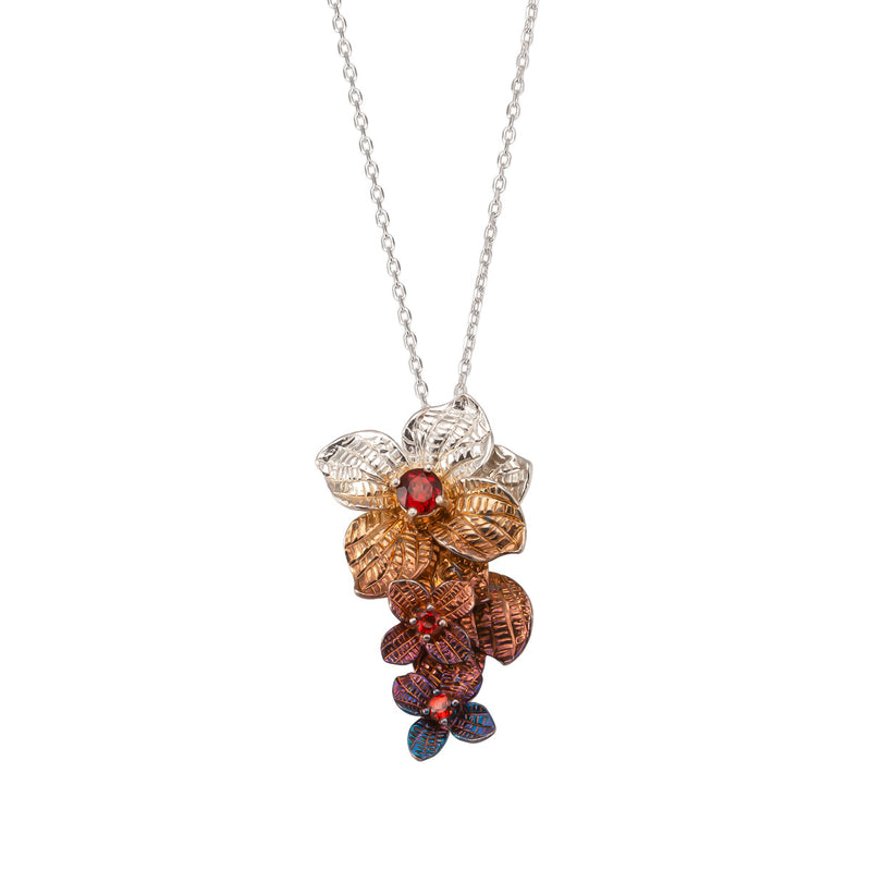 Koru on valmistettu hopeasta, joka on saanut poikkeuksellisen värimaailmansa erityisen lämpökäsittelyn avulla. Kovassa kuumuudessa hopean pintaan muodostuu luonnollinen, hehkuva värikerros – vivahteita oranssista ja punaisesta aina syvään siniseen. Koska lämpökäsittely tehdään käsityönä, niin jokainen koru on oma uniikki kappaleensa, eikä kahta täysin samanlaista värimaailmaa esiinny.