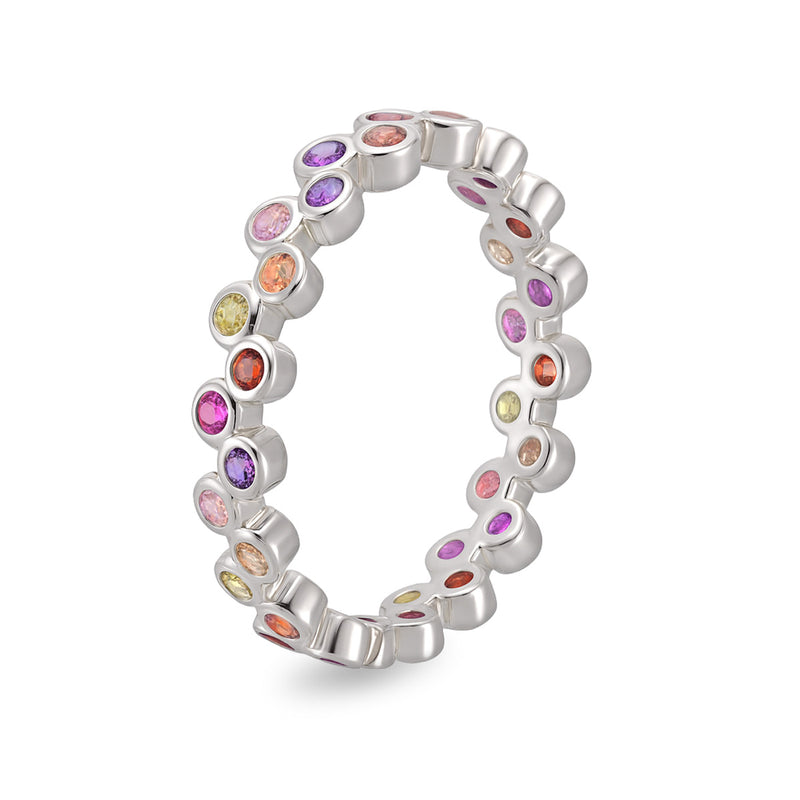 Suloinen allianssisormus säihkyy herkissä sateenkaaren väriessä. Hopeiseen runkoon on upotettu värillisiä korukiviä, jotka luovat yhdessä ihanan sävymaailman.