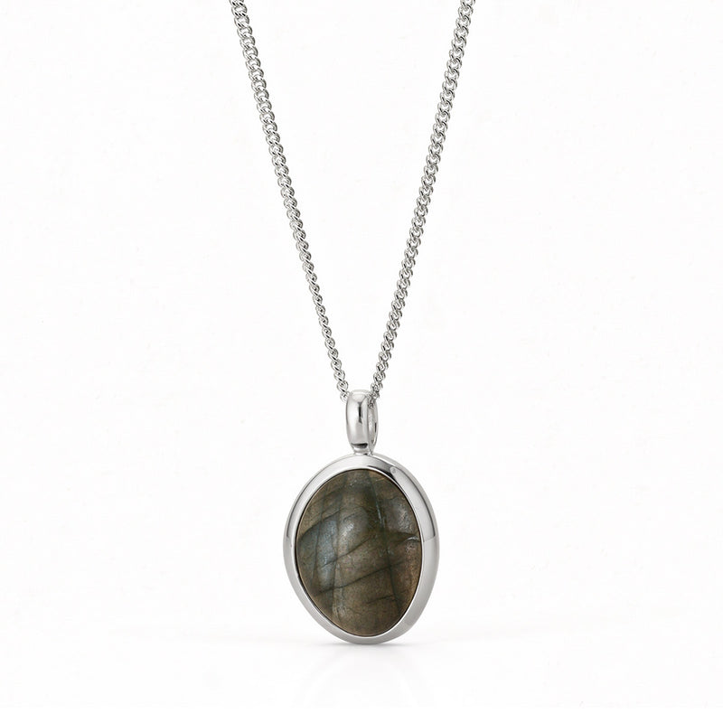 Tässä minimalistisessa kaulakorussa on keskiössä pyöristettyyn cabochon-muotoon leikattu spektroliitti korukivi. Tummassa kivessä erottaa luonnonvalossa harmaan, ruskean, sinisen ja vihreän vivahteita. Minimalistinen hopeinen kehys korostaa kiven kauneutta ja tekee korusta ajattoman tyylikkään.