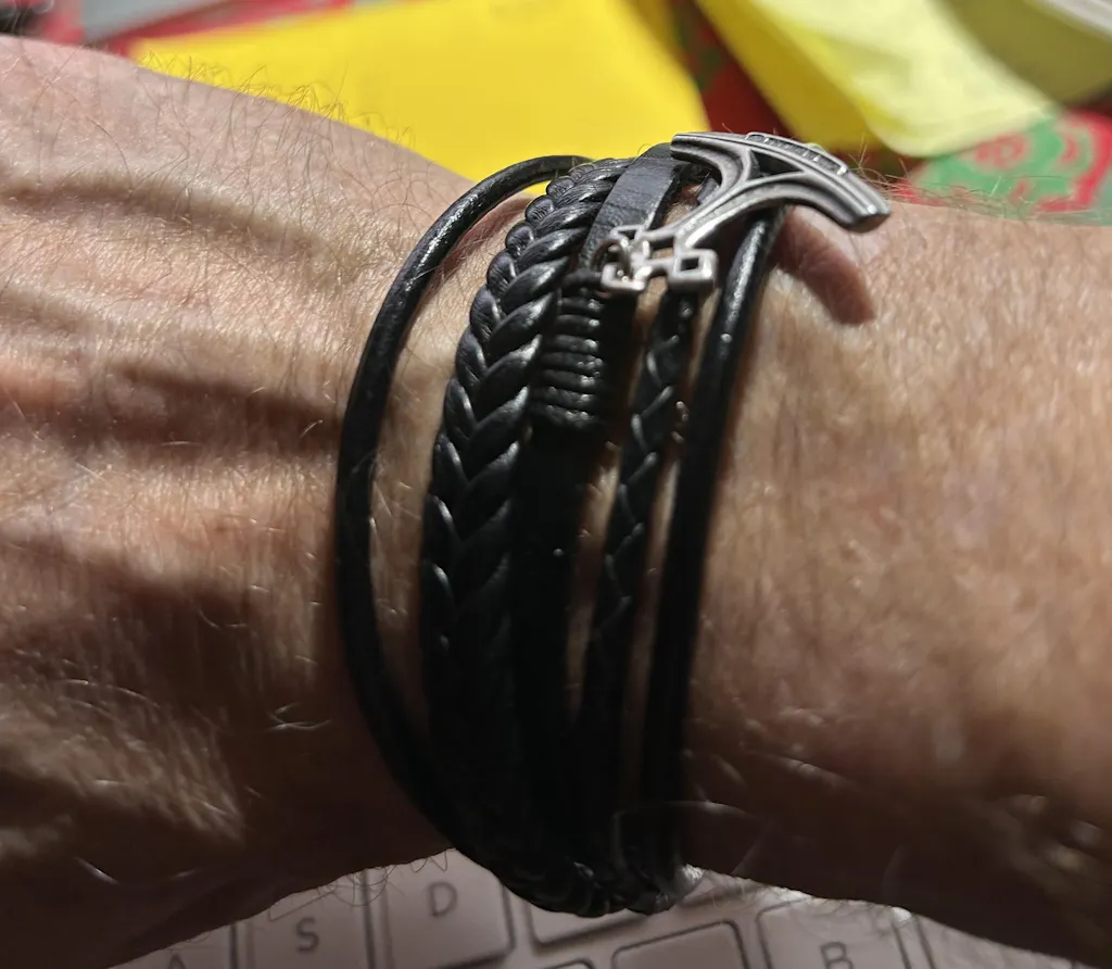 Suosittu monikerroksinen nahkarannekoru malli, jossa kapeita ja leveämpiä nauhoja vierekkäin. Tukeva teräslukko. Hyvä yleismalli joka sopii useimpiin ranteisiin.