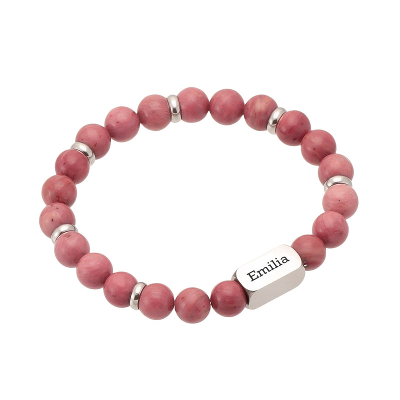 Ruusunmarjan punainen rodoniitti rannekoru, jonka koristeeseen voit lisätä oman tekstin