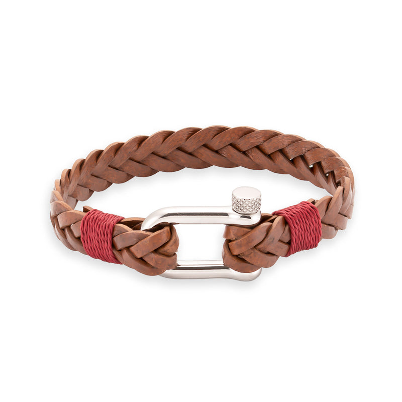 Korussa on kauniisti punottu, lämpimän sävyinen keskiruskea nahkanyöri, johon punertavat langat tuovat kontrastia.