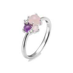 Elegantti sormus täynnä herkkää kauneutta. Sormuksessa yhdistyy kolme tasapainoista luonnon omaa sävyä: vaaleanpunainen ruusukvartsi, lila ametisti ja viileä kuukivi.