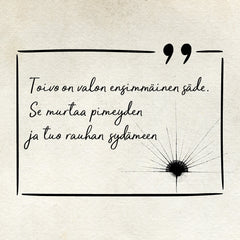 Toivo on valon ensimmäinen säde. Se murtaa pimeyden ja tuo rauhan sydämeen. Valontuoja-koru syntyi muistuttamaan, että pimeys on vain väliaikaista. Se on lempeä lupaus, että kannat valoa mukanasi silloinkin, kun sitä on vaikea nähdä. Koru on kunnianosoitus sitkeydelle ja sille kirkkaudelle, joka asuu meissä kaikissa.